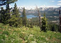 You'll come to the Pacific Crest Trail at 3.80 miles. Turn right toward Showers Lake. The trail winds through high alpine red heather which blooms in July. One more Texas gate to go through, and then the trail drops towards Showers Lake which is two miles further. Take a minute here to look at your map and pick out Heavenly Valley, Freel Peak, Waterhouse Peak, Stevens Peak, and Red Lake Peak (looking from left to right). All of Meiss Country is at your feet. Locate Dardanelles Lake down the drainage to your left. Meiss Lake and Meiss Meadows are below.