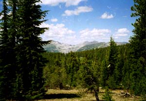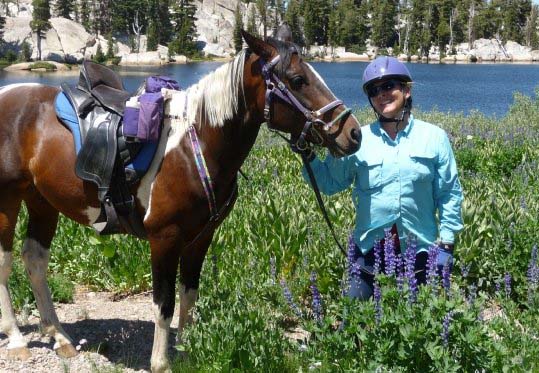 Out of Showers Lake, you want to be sure to take the trail that goes steep up to the ridge (this juncture is not marked). If you start to drop to Meiss Meadow, you've gone the wrong way. From Showers Lake to the top of the ridge is over two miles of steep climbing. Your horse should be in good shape to haul you up this 700 foot elevation gain to 9,300 feet! It's okay to stop often, though, because the views just continue to get better! You soon see Mokelumne Peak to the south and then Reynolds Peak out by Ebbetts Pass. Then, as you gain the ridge, you'll see Caples Lake and Schneider Cow Camp once again. An incredibly gorgeous tour! Descend the trail back to camp. There'll be one more gate to pass through at the bottom.